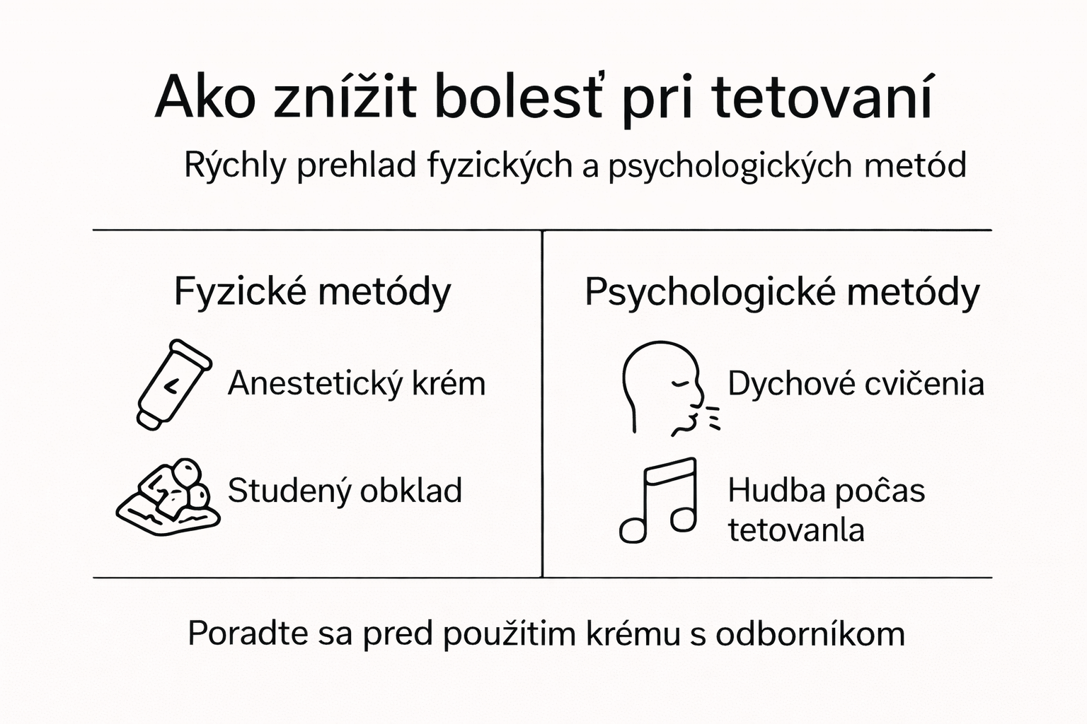 | Psychologické faktory | Stres a psychické nastavenie môžu znásobiť vnímanie bolesti, preto sa odporúča relaxácia pred tetovaním. |
